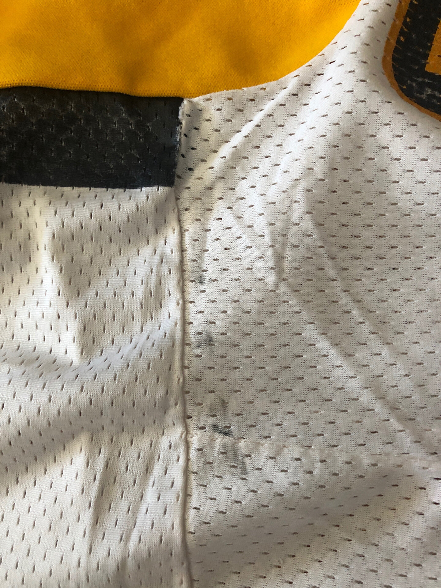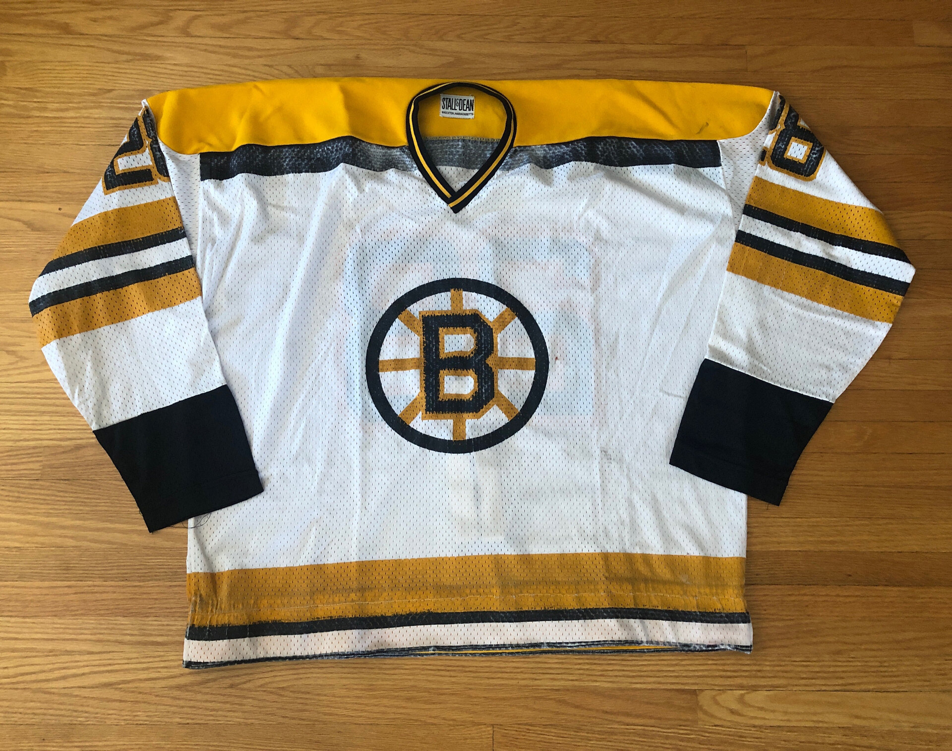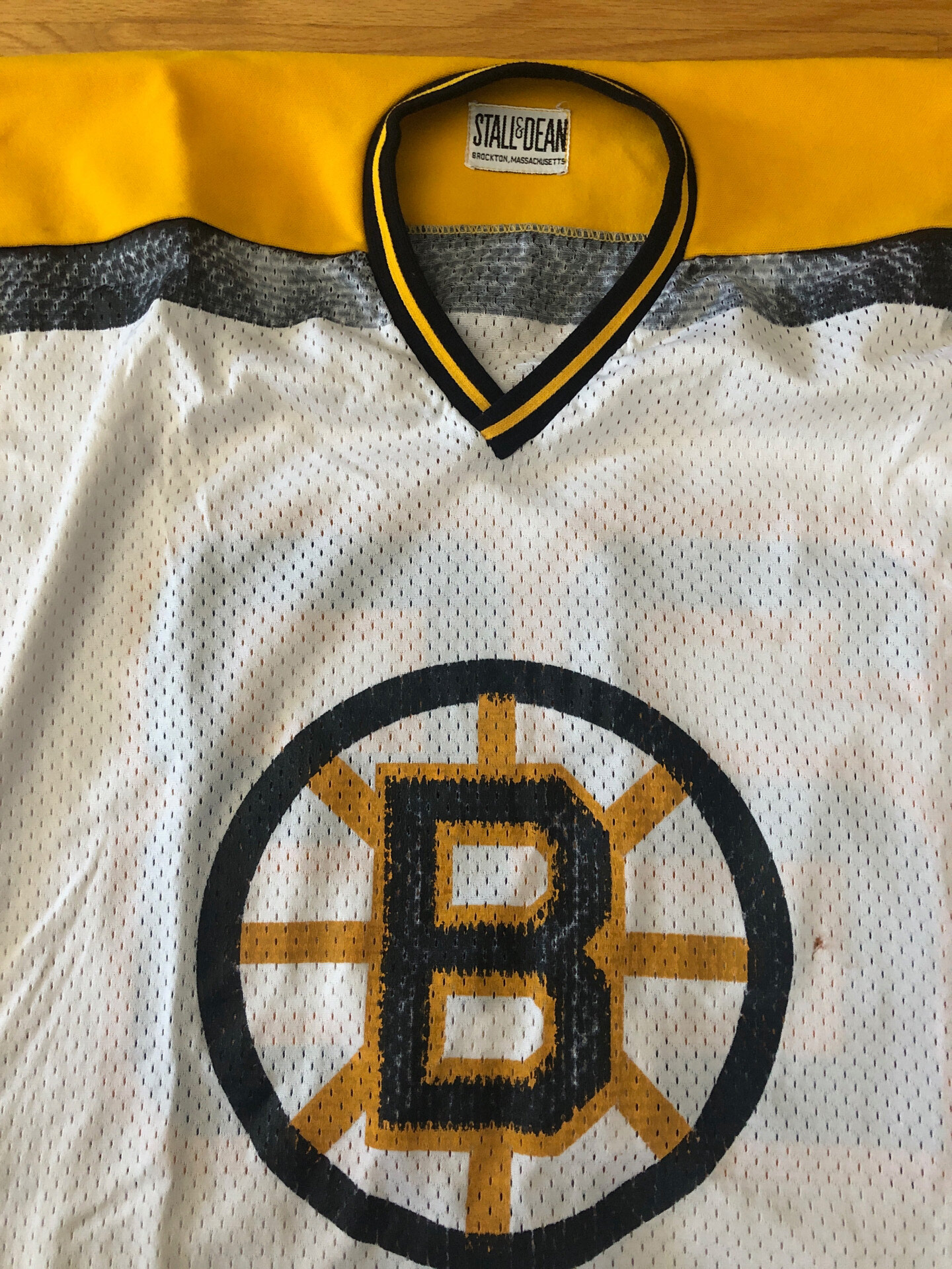 This jersey measures to a size 54 (27" chest). The body is composed of a lightweight white mesh with black and gold trim. The shoulder and original hem are made of a heavy cotton knit material. All the cresting and numbers are screened on. This is the only example of these jerseys I have seen that has the original Stall And Dean Brockton Massachusetts tag in the collar. There is another tag present in the lower left gold knit hem, but it is not visible due to the hem being turned under and a new hem being created. It does however appear to be a "wash" tag.