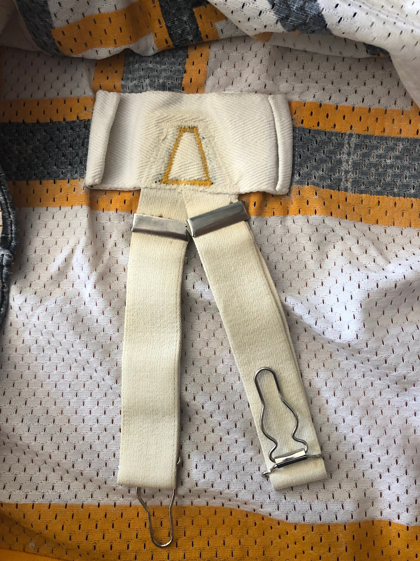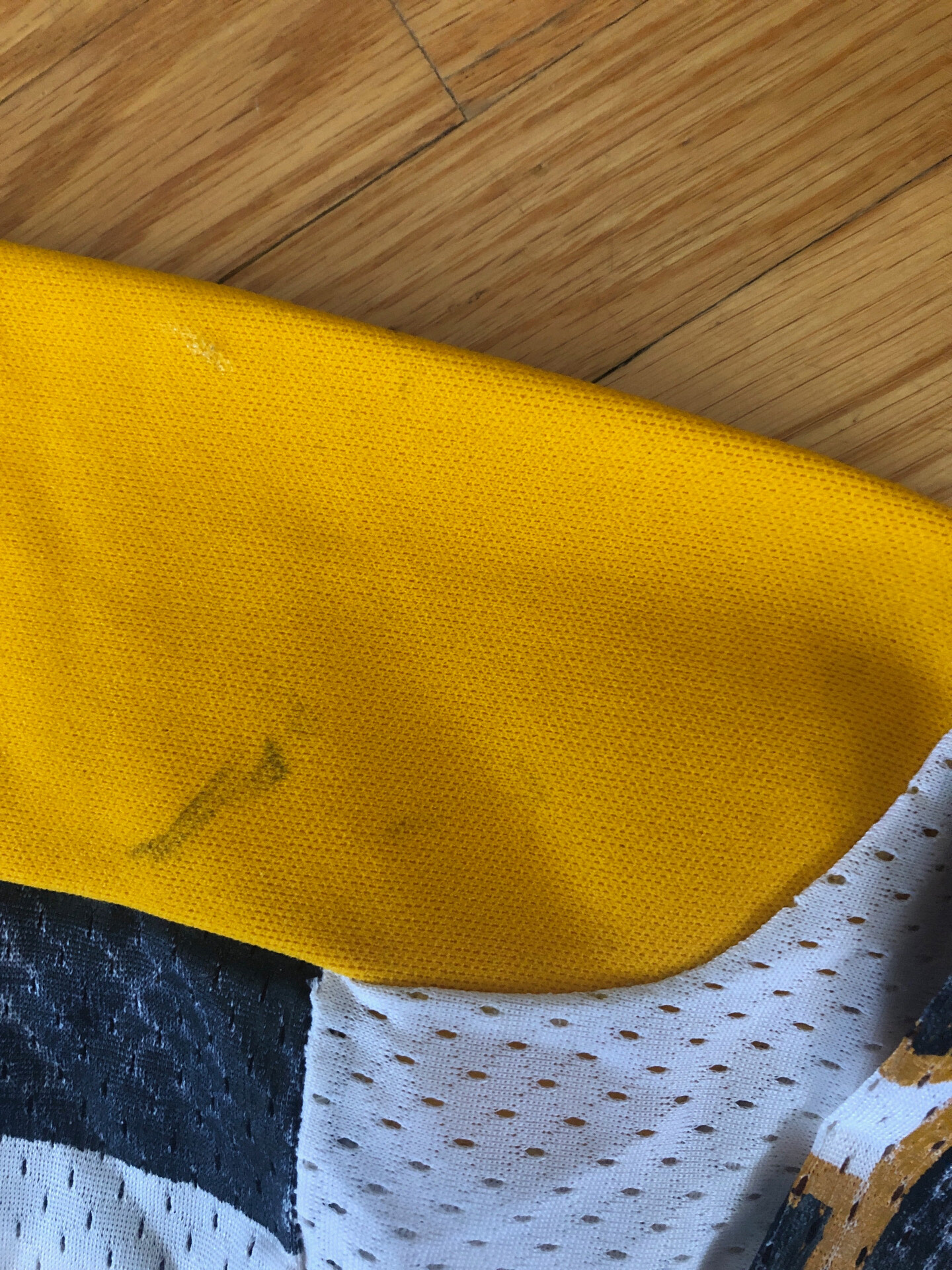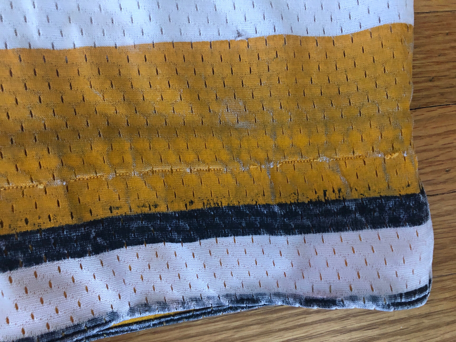 This jersey measures to a size 54 (27" chest). The body is composed of a lightweight white mesh with black and gold trim. The shoulder and original hem are made of a heavy cotton knit material. All the cresting and numbers are screened on. This is the only example of these jerseys I have seen that has the original Stall And Dean Brockton Massachusetts tag in the collar. There is another tag present in the lower left gold knit hem, but it is not visible due to the hem being turned under and a new hem being created. It does however appear to be a "wash" tag.
