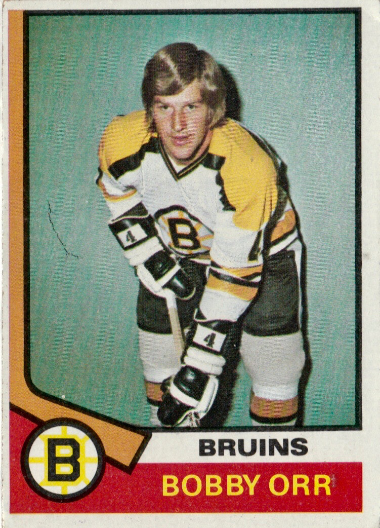 This jersey was worn by defenseman Doug Roberts during the 1972-73 Regular Season and potentially the Stanley Cup Playoffs. The Bruins were eliminated in 5 games in the quarter final vs the New York Rangers. A story that has surfaced regarding these jerseys is that Phil Esposito got injured in game 2 of this quarter final while wearing these jerseys. As a result the team thought the jerseys were cursed and chose to never wear them again in actual regular season or playoff competition. While this may be true, I believe there may have been several factors that contributed to the teams decision to not use these any longer. First, it appears that the jerseys did not have a consistent fit. The Bruins wore these jerseys for photo shoots the following season and most of these images appeared on the 1974 OPC hockey cards. In these images you can see that some of the players had to have the jerseys shortened (including this one) by folding the gold knit hem under and creating a new hem. (You can see in the attached photo of Bobby Orr that he also had this customization on his jersey). Secondly when putting the jersey over one's head, it is very tight and uncomfortable and would be most restricting in the neck area. And finally, the jerseys did not appear to wash very well as observed in the greying affect that resulted in the black screened on areas of the jersey.